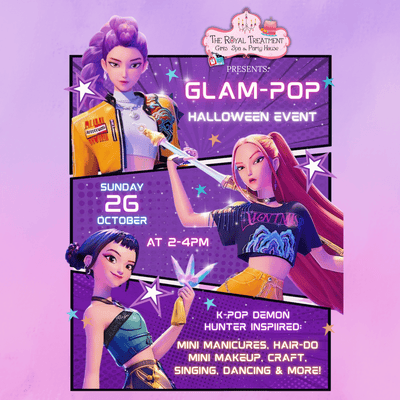 GLOW, GLAM & SPARKLE! Join the ultimate K-Pop Demon Hunter Halloween party! Kids will transform into their favorite Demon Hunter, create a keepsake, sing and dance to their favorite songs, and take home fun little surprises. Spots are very limited, dont miss out!